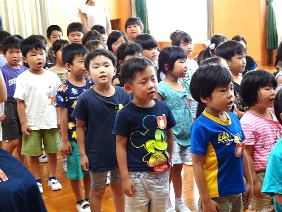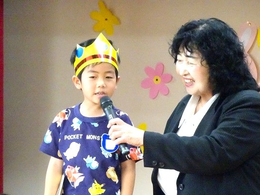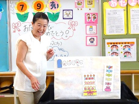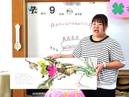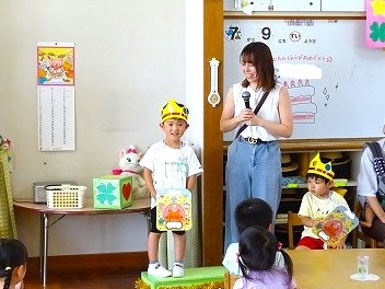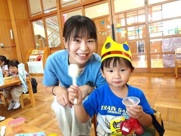 2025年7月9日 誕生会 <ねらい> 7月生まれの友だちを知り、お祝いする気持ちをもつ また、誕生児は1つ大きくなったことを喜ぶ ※年長組・年中組は2階ホール、年少組・いちご組は各お部屋で行いました 【2階ホール】 年長組は自分の名前や大きくなったら 何になりたいかを発表しました! 年中組は自分の名前を発表しました! おうちの方からお祝いの言葉を いただきました 年長組の歌♪ 『くじらのバス』 年中組の歌♪ 『スターマンの歌』 園長先生のお話 『すいか』 先生からのプレゼント☆ 職員劇 『まねっこカラス』 ホールでの誕生会の後、 お部屋でおうちの方と一緒に おやつをいただきました!! 【年少組】 おうちの方からお祝いの言葉を いただきました 先生からのプレゼント☆ うさぎ組 エプロンシアター 『にんじんさん なぜなぜあかい』 ことり組 大型絵本 『おおきなかぶ』 おうちの方と一緒に おやつをいただきました!! 【いちご組】 先生からのプレゼント☆ ももいちご組 パネルシアター 『でてこい でてこい』 おうちの方と一緒に おやつをいただきました!! 写真館TOPに戻る