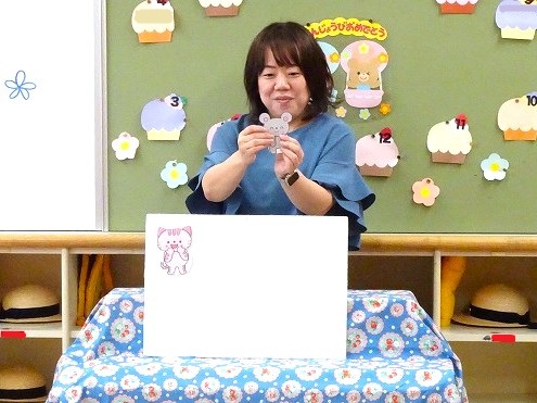 2025年8月8日 誕生会 <ねらい> 8月生まれの友だちを知り、お祝いする気持ちをもつ また、誕生児は一つ大きくなったことを喜ぶ ※年長組・年中組は2階ホール、年少組・いちご組は各お部屋で行いました 【2階ホール】 年中組は自分の名前を発表しました! 年長組は自分の名前や、大きくなったら 何になりたいかを発表しました! おうちの方からお祝いの 言葉をいただきました 年中組の歌♪『とんでったバナナ』 年長組の歌♪『しりとりうた』 園長先生のお話 『お盆・きゅうり馬・なす牛』 先生からのプレゼント☆ ペープサート『はだかの王様』 ホールでの誕生会の後、 お部屋でおうちの方と一緒に おやつをいただきました!! 【年少組】 おうちの方からお祝いの 言葉をいただきました 先生からのプレゼント☆ うさぎ組 大型絵本 『おおきなかぶ』 ことり組 パネルシアター 『かくれんぼ』 おうちの方と一緒に おやつをいただきました!! 【いちご組】 先生からのプレゼント☆ パネルシアター『いないいないばあ』 この後、おうちの方と一緒に おやつをいただきました!! 写真館TOPに戻る