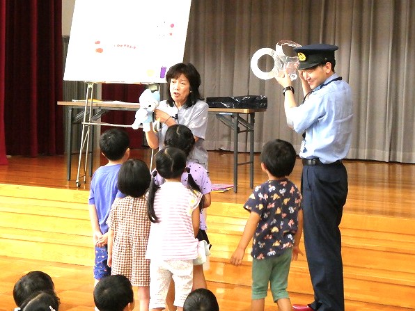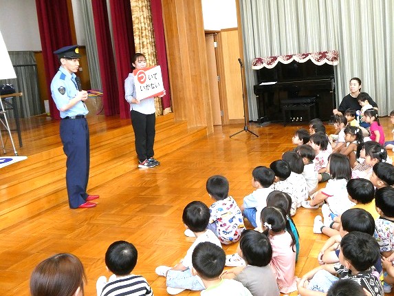 2025年7月3日 防犯教室 <ねらい> ・連れ去りから身を守ることを知る ・安全に遊んだり、生活を送ったりできるよう話を聞く はじめに園長先生の お話を聞きました 豊田警察署 道脇巡査部長 昭和区防犯協会 近藤先生 『つ・み・き・お・に』の お約束を教えてもらいました! つ⇒ついていかない み⇒みんなといつもいっしょ き⇒きちんとしらせる お⇒おおごえでたすけをよぶ に⇒にげる ぶーちゃんをさらった猫を みんなで警察に知らせて 逮捕してもらいました!! 写真館TOPに戻る
