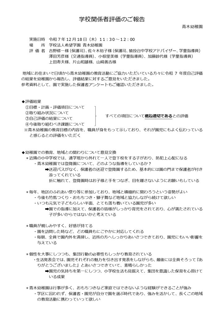 学校関係者評価のご報告 2026.03.24 令和7年度の青木幼稚園の教育活動について、園関係者の皆様から貴重なご意見をいただきました。 この結果を踏まえ、教育活動のさらなる充実、教職員の資質向上に努めてまいります。